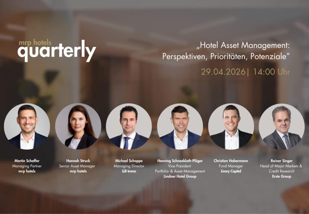 Martin Schaffer, Managing Partner bei mrp hotels, Hannah Struck, Senior Asset Manager bei mrp hotels, Michael Schoppe, Managing Director bei LLB Immo, Henning Schneekloth-Plöger, Vice President Portfolio- & Asset Management bei Lindner Hotel Group, Christian Habermann, Fund Manager bei Livory Capital, und Rainer Singer, Head of Major Markets & Credit Research bei Erste Group, geben im Gespräch mit Nikolaus von Raggamby (RUECKERCONSULT) einen fundierten Marktüberblick und beleuchten die aktuelle Betreiberlandschaft ebenso wie Eigentümerinteressen, Betreiberperformance sowie Investitions- und Repositionierungsfragen.