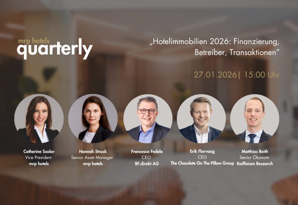 Catherine Szolar, Vice President bei mrp hotels, Hannah Struck, Senior Asset Manager bei mrp hotels, Francesco Fedele, CEO bei BF.direkt AG, Erik Florvaag, CEO und Managing Partner bei The Chocolate on the Pillow Group, und Matthias Reith, Senior Ökonom bei Raiffeisen Research, geben im Gespräch mit Nikolaus von Raggamby (RUECKERCONSULT) einen aktuellen Überblick und kommentieren die Entwicklungen am Hotelimmobilienmarkt in Deutschland und in Österreich zu folgenden Themen: